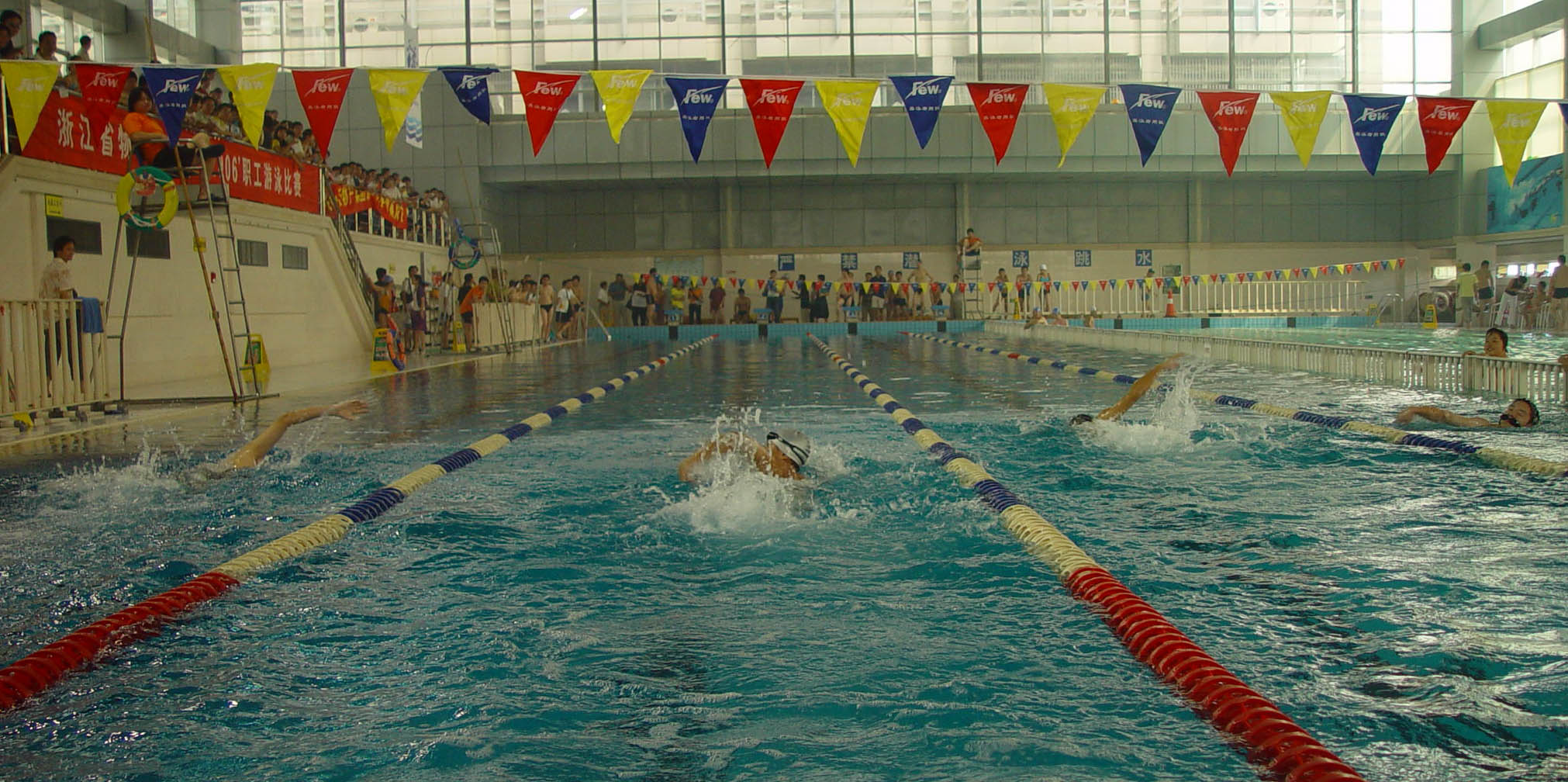 比賽分蛙泳、自由泳,按照性別和年齡段的不同分設(shè)11個(gè)項(xiàng)目,為體現(xiàn)浙江物產(chǎn)的團(tuán)隊(duì)精神,比賽組委會(huì)還特設(shè)4*50米團(tuán)體接力項(xiàng)目,集團(tuán)十家成員單位的近140名員工報(bào)名參加了比賽。比賽在熱烈的氣氛中進(jìn)行。泳池內(nèi)白浪翻滾、泳花四濺,運(yùn)動(dòng)員們奮勇爭先、劈波斬浪,一些曾經(jīng)受過專業(yè)訓(xùn)練的選手為大家展示了精湛的游泳技術(shù),而更多游泳愛好者則展現(xiàn)了浙江物產(chǎn)員工的拼搏精神,和對游泳、對生活的熱愛??磁_(tái)上歡呼聲、加油聲此起彼伏,拉拉隊(duì)員們揮舞的小紅旗、打出的橫幅成了另一道風(fēng)景。比賽場面緊張激烈,異彩紛呈,選手們發(fā)揮了較高的競技水平,展現(xiàn)了良好的比賽作風(fēng),很多項(xiàng)目的競爭呈現(xiàn)白熱化,幾位選手的成績差距很小,充分體現(xiàn)了浙江物產(chǎn)員工積極向上的精神風(fēng)貌。