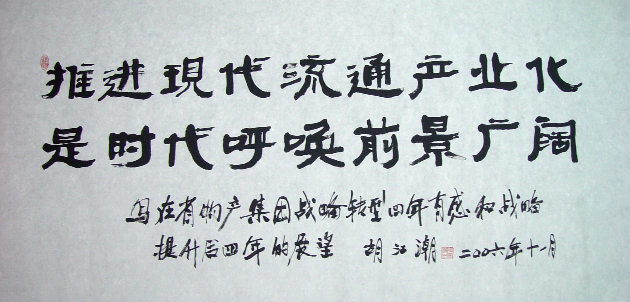 本次主題攝影書畫比賽及展覽活動得到了集團領(lǐng)導的大力支持。集團公司黨委書記、董事長胡江潮親自為本次展覽題詞:“推進現(xiàn)代流通產(chǎn)業(yè)化,是時代呼喚前景廣闊”。