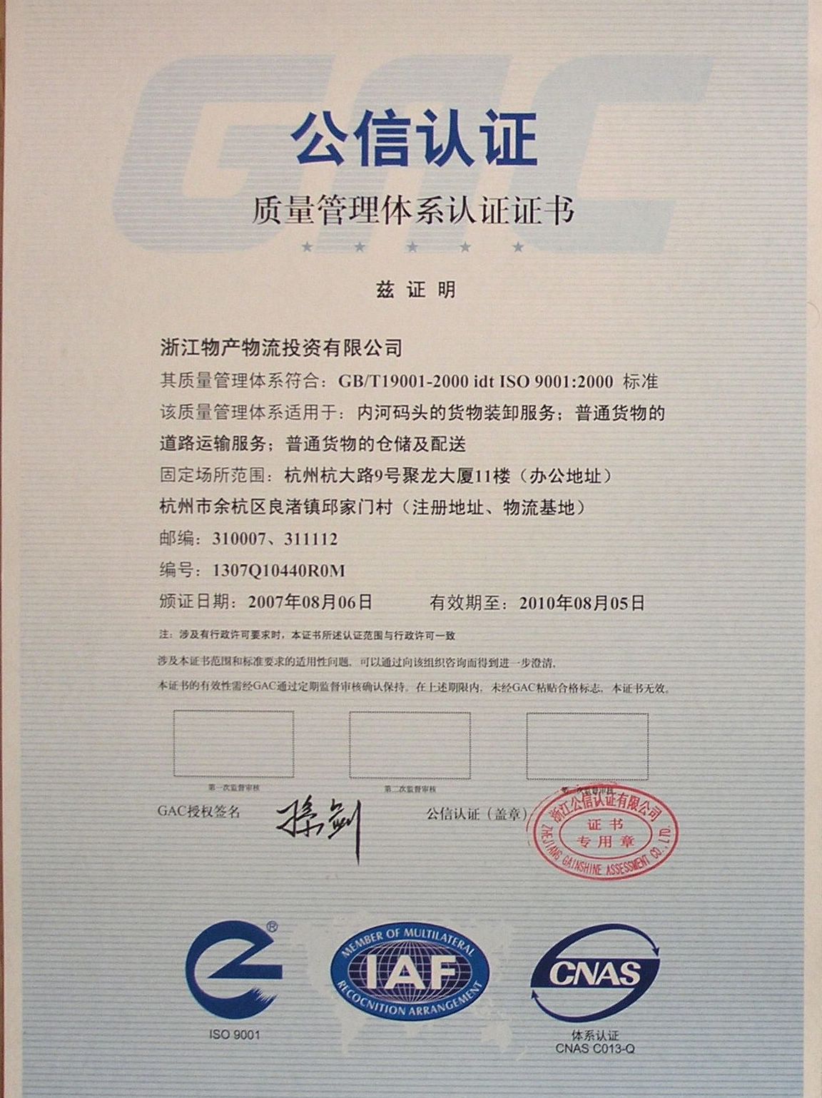 繼6月底通過現(xiàn)場(chǎng)審核后,浙江物產(chǎn)物流投資有限公司于日前通過了國(guó)家認(rèn)可委員會(huì)(CNACR)的復(fù)審,最終獲得了ISO9001:2000《質(zhì)量管理體系認(rèn)證證書》。此舉標(biāo)志著物產(chǎn)物流公司在質(zhì)量控制、服務(wù)意識(shí)、規(guī)范管理等方面邁上了一個(gè)新臺(tái)階,也標(biāo)志著在打造“精品物流基地”方面取得了新的進(jìn)步,為公司爭(zhēng)取4A級(jí)物流企業(yè)創(chuàng)造了有利條件?!。ㄊY京丹)