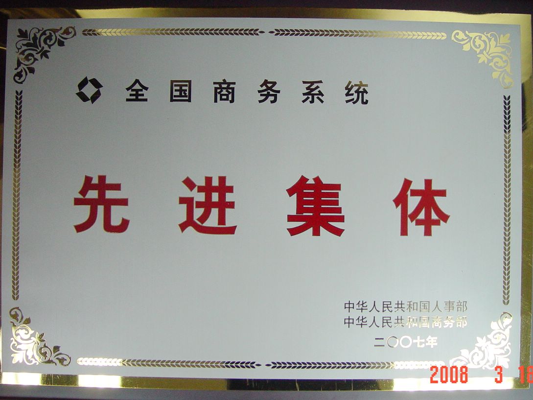 首次“全國(guó)商務(wù)系統(tǒng)先進(jìn)集體、勞動(dòng)模范和先進(jìn)工作者表彰大會(huì)”日前在北京人民大會(huì)堂隆重舉行。國(guó)務(wù)院副總理吳儀和國(guó)家商務(wù)部、人事部等部門領(lǐng)導(dǎo)出席了會(huì)議,并向獲得榮譽(yù)稱號(hào)的先進(jìn)單位和個(gè)人代表頒發(fā)了獎(jiǎng)牌、獲獎(jiǎng)證書(shū)和獎(jiǎng)?wù)?。我集團(tuán)公司喜獲2007年度“全國(guó)商務(wù)系統(tǒng)先進(jìn)集體”光榮稱號(hào)。集團(tuán)公司副董事長(zhǎng)、總經(jīng)理孟偉林出席了表彰大會(huì)并領(lǐng)取獎(jiǎng)牌和榮譽(yù)證書(shū)。(據(jù)物產(chǎn)報(bào))