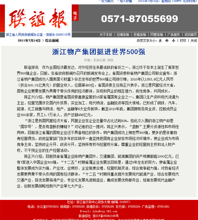 聯(lián)誼報訊 作為全國經(jīng)濟(jì)最發(fā)達(dá)、對外經(jīng)貿(mào)往來最活躍的省份之一,浙江終于在本土誕生了首家世界500強(qiáng)企業(yè)。日前,在省政府新聞辦召開的新聞發(fā)布會上,省國資委和省物產(chǎn)集團(tuán)公司聯(lián)合宣布:浙江省物產(chǎn)集團(tuán)成功入圍美國《財富》雜志發(fā)布的世界500強(qiáng)公司排行榜,2010年以1353.9億元人民幣(折合200.01億美元)的營業(yè)收入,位居第483位。省國資委主任陳正興表示,浙江是民營經(jīng)濟(jì)大省,國有企業(yè)更要發(fā)展為具骨干帶頭作用的經(jīng)濟(jì)群體,實(shí)現(xiàn)和民企的相互借力、良性競爭、共同成長。